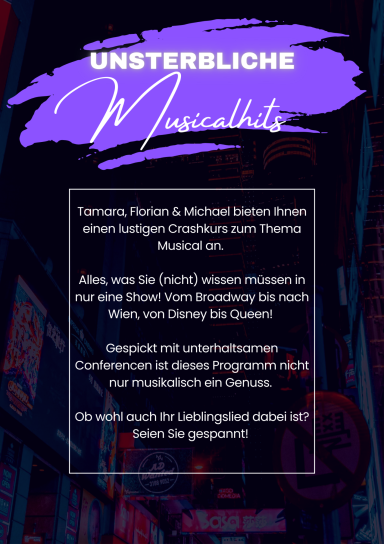 Tamara Peters, Florian Albers und Michael Baute nehmen Sie mit auf eine charmante Reise durch die Welt der bekanntesten Musicals. In einem unterhaltsamen Crashkurs rund um das Thema Musical verbinden sie Gesang, Comedy und kurzweilige Moderationen zu einer Show, die nicht nur Musicalfans begeistert. Begleitet von live gespielter Musik am Flügel entsteht ein abwechslungsreiches Programm, das musikalisch wie humorvoll überzeugt.